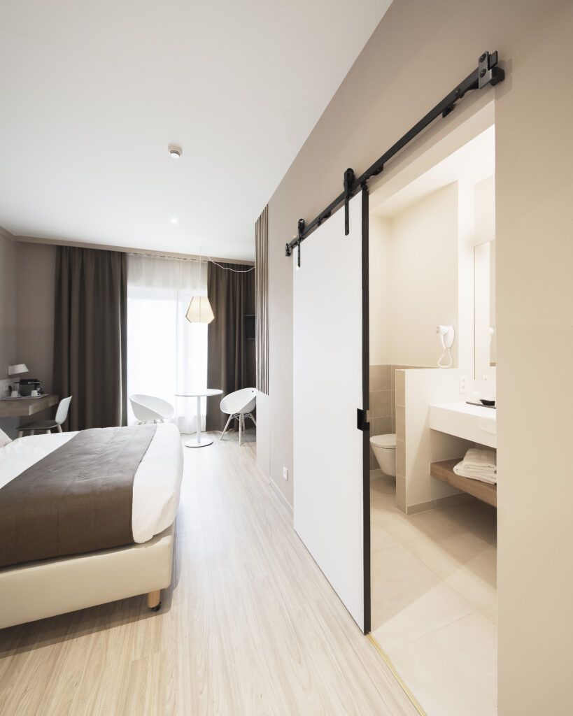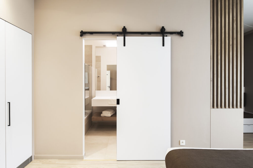 Durų fiksavimas: paslėpti „stopperiai“ su nematoma spaustuko (clamp) fiksacija, stabiliai laiko duris padėtyje