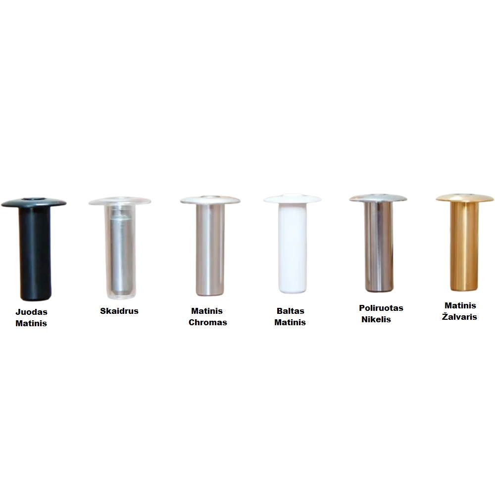 Juodas matinis, skaidrus, matinis chromas, baltas matinis, poliruotas nikelis, matinis žalvaris