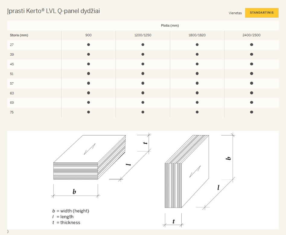 CE ir UKCA ženklinimas pagal EN 14374, projektavimui naudojami Eurocode 5 (EN 1995) projektiniai parametrai.