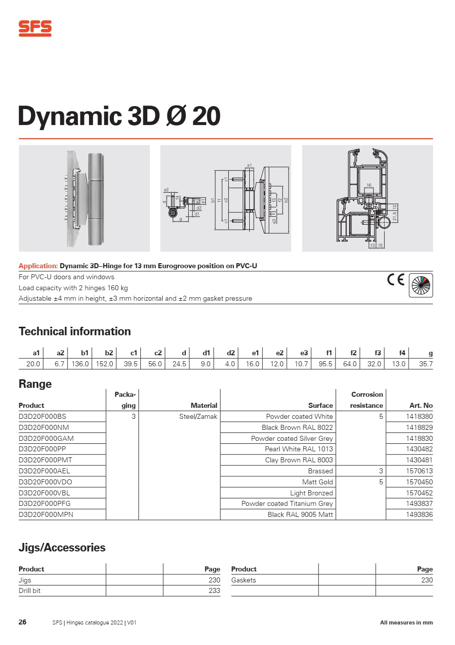 Universalumas – tinka skirtingoms medžiagoms. Dynamic 3D Ø 20 mm pritaikomas PVC – U, aliuminio, medienos ar mediena – aliuminis durims, be to – tinka tiek kairinėm, tiek dešinėm durim.
